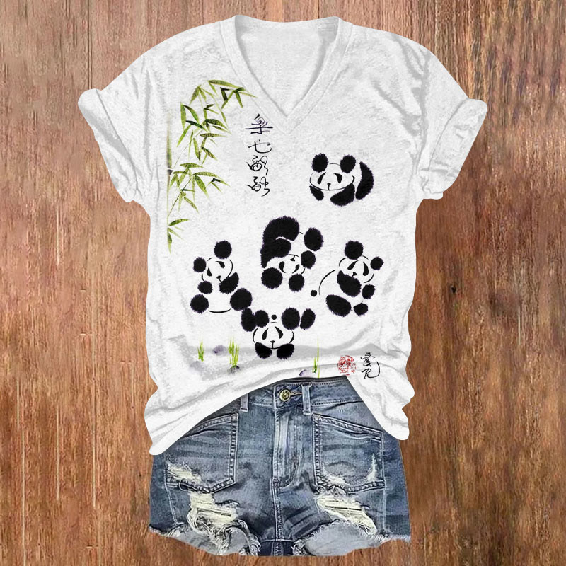 Dashingsoul Adorable Happy Panda Family Print V-neck Causal T-shirt