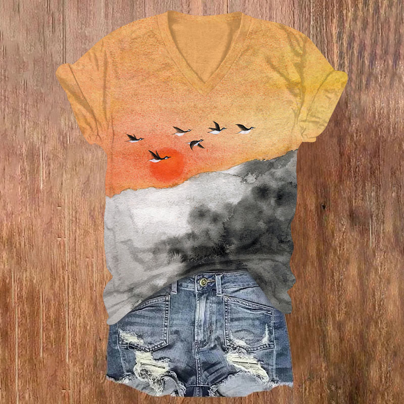 Dashingsoul Retro Zen Sunset Print V-neck Causal T-shirt