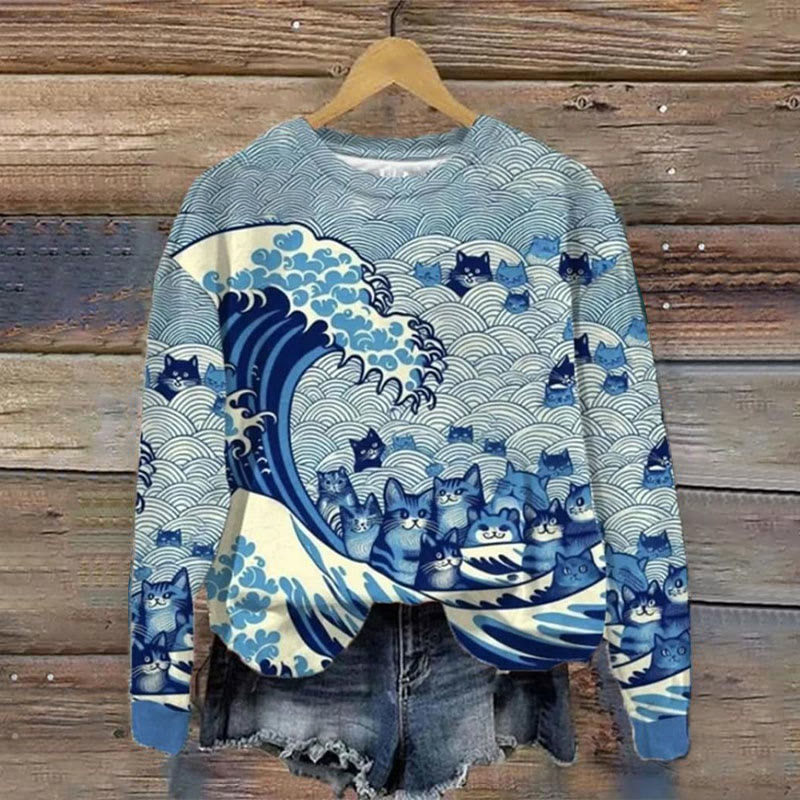 Japanese Retro Abstract Wave Whale Tail Art Print Sweatshirt