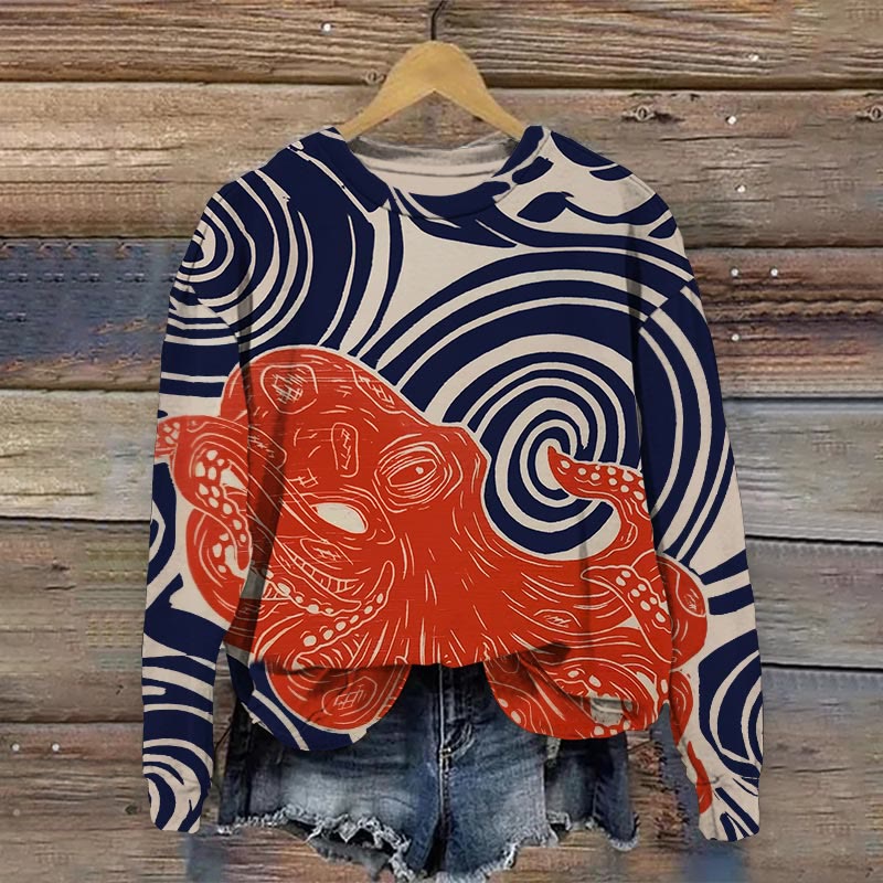 Japanese Retro Abstract Water Ripple Octopus Art Print Sweatshirt
