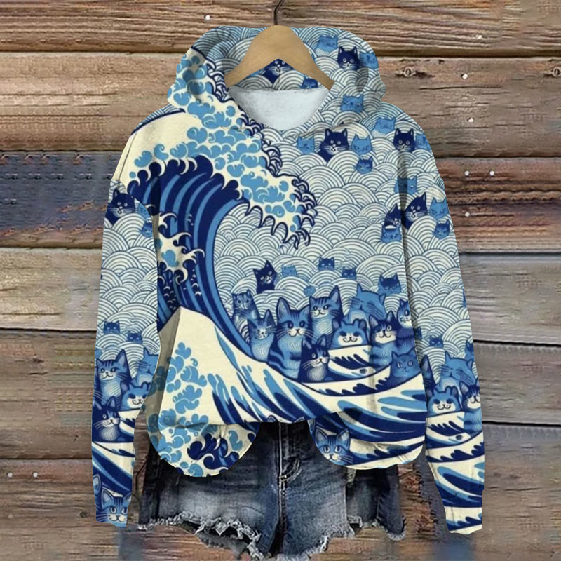Dashingsoul Wave Rippled Kitten Print Casual Long Sleeve Hoodie