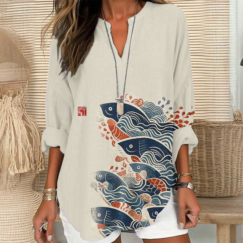 Dashingsoul Japanese Fish Art Print V Neck Long Sleeve Blouse