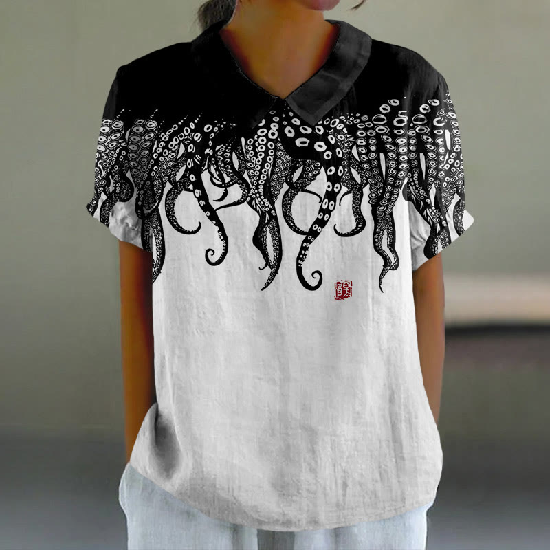 Dashingsoul Women's Black Octopus Art Lapel Loose Blouse