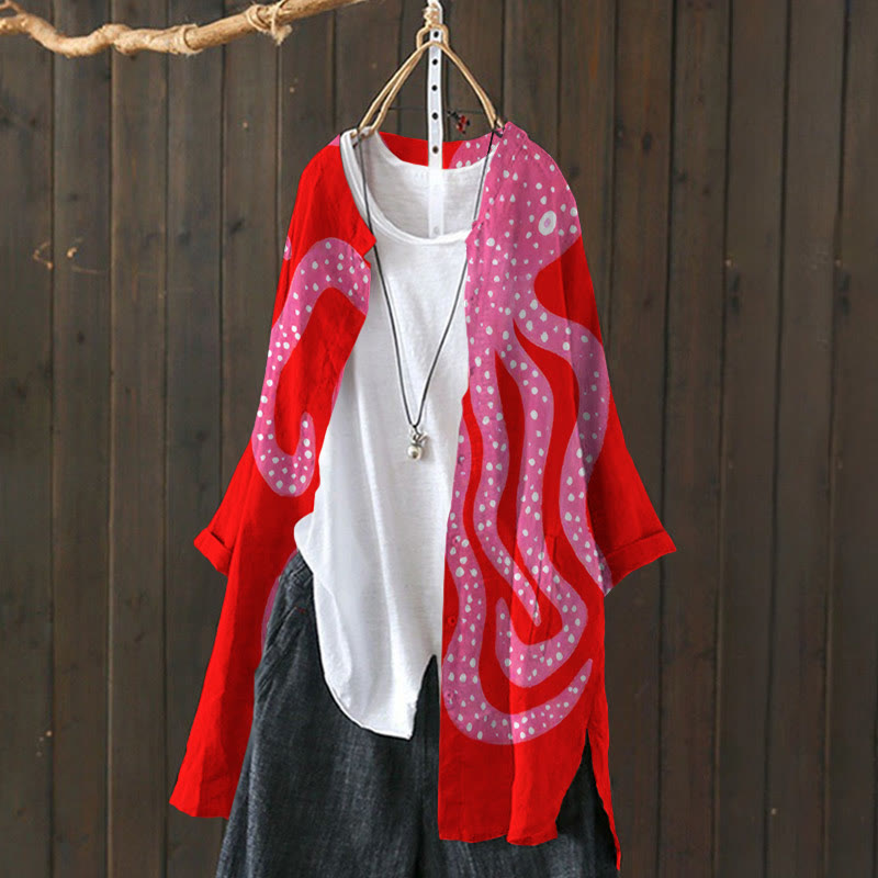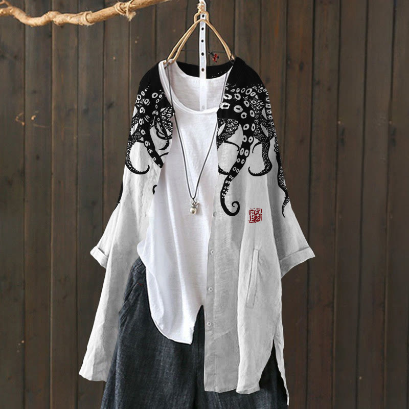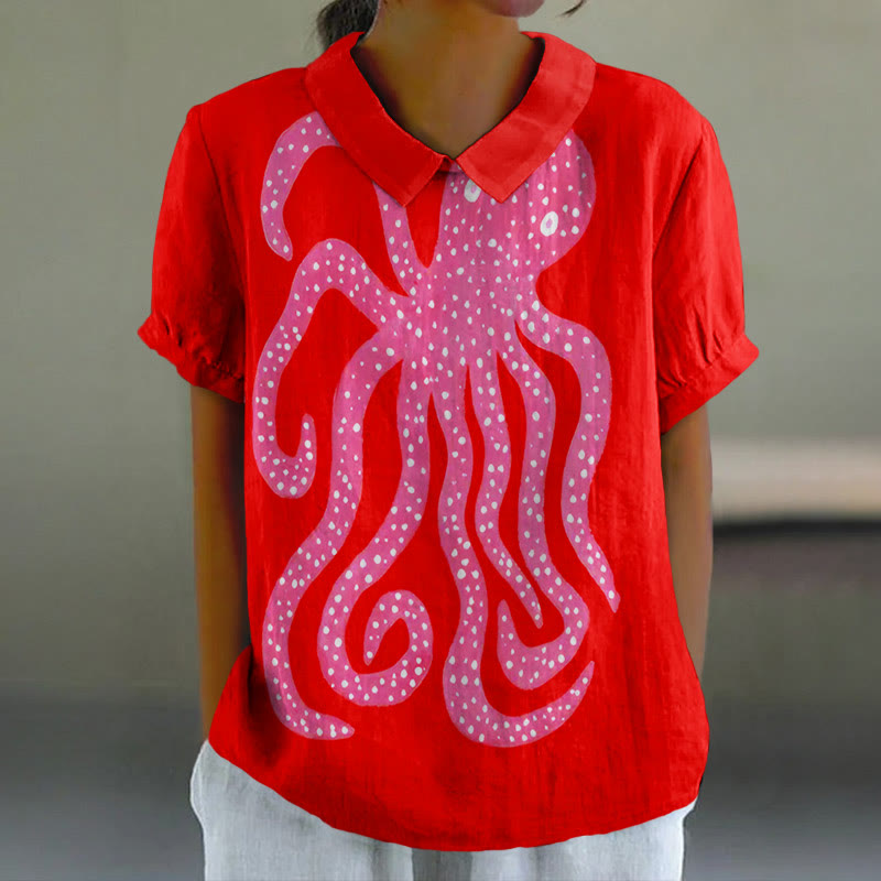 Dashingsoul Women's Oil Painting Pink Octopus Art Lapel Loose Blouse