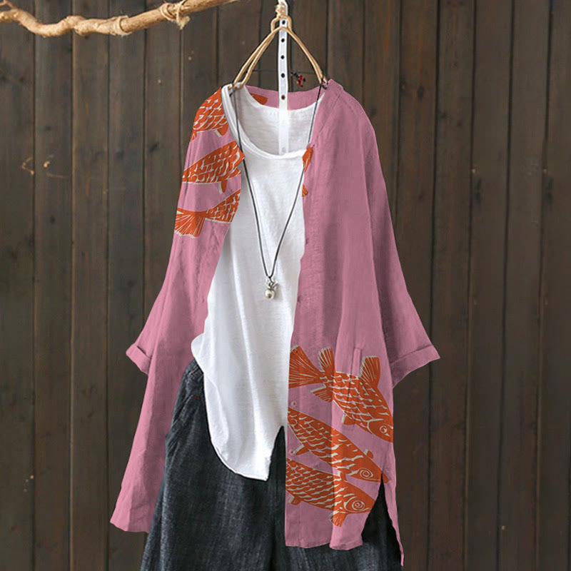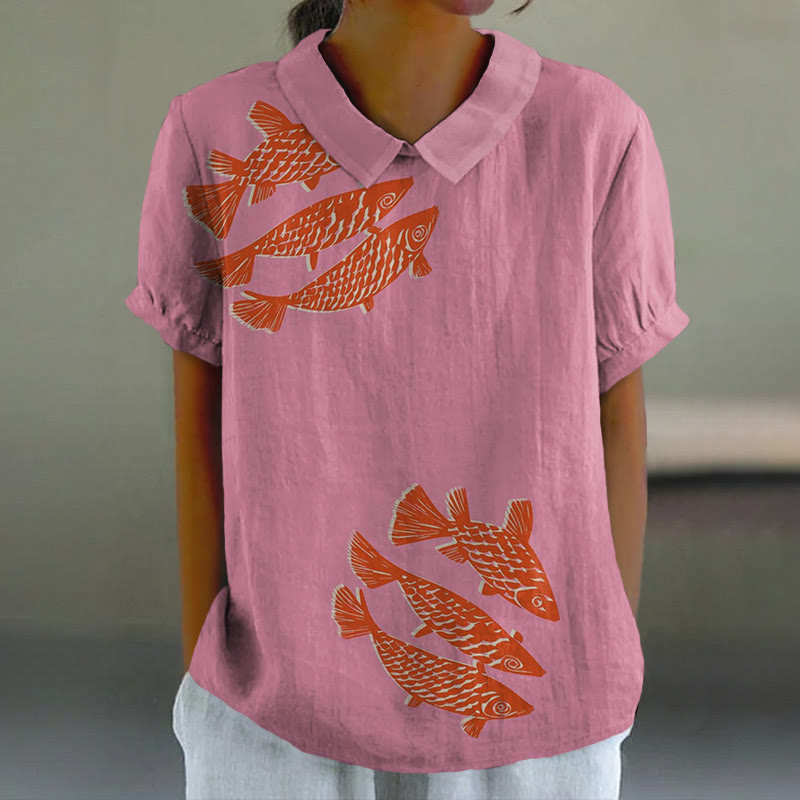 Dashingsoul Women's Lucky Red Koi Fish Lapel Loose Blouse