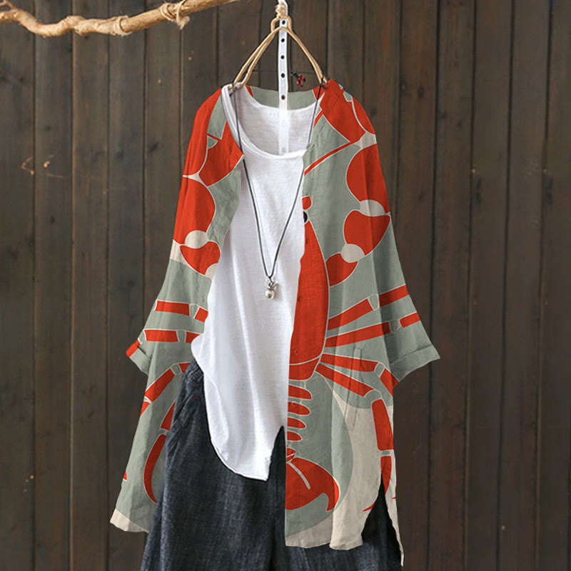 Dashingsoul Women's Vintage Red Lobster Art Lapel Loose Blouse