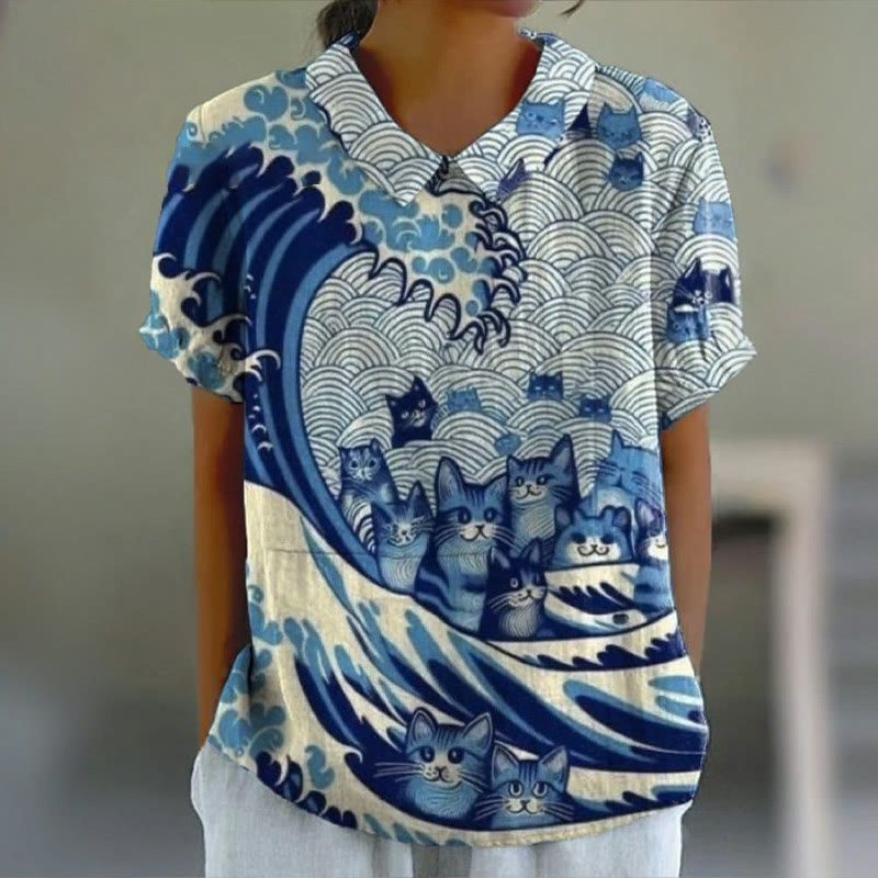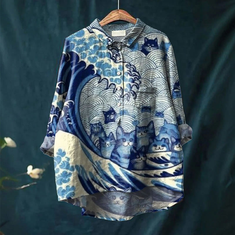 Dashingsoul Women's The Blue Wave&cats Art Print Lapel Loose Blouse