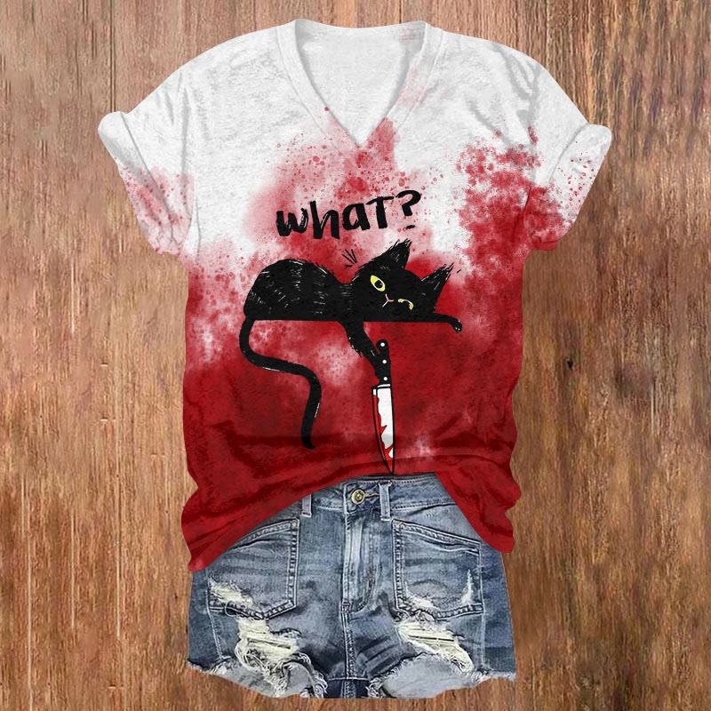 Dashingsoul Bloody Funny Black Cat With Knife Ombre Print Halloween Casual V-neck Short-sleeved T-shirt