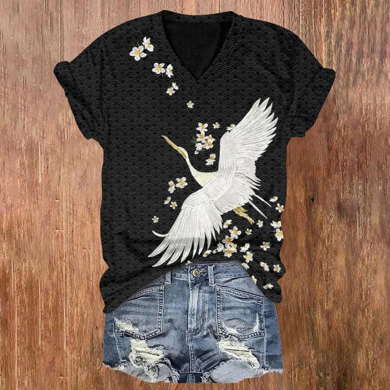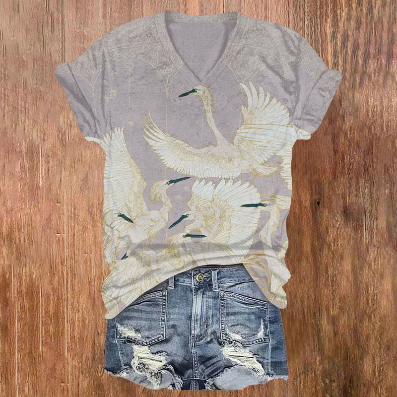 Dashingsoul Dancing Cranes Print Casual V-neck Short-sleeved T-shirt