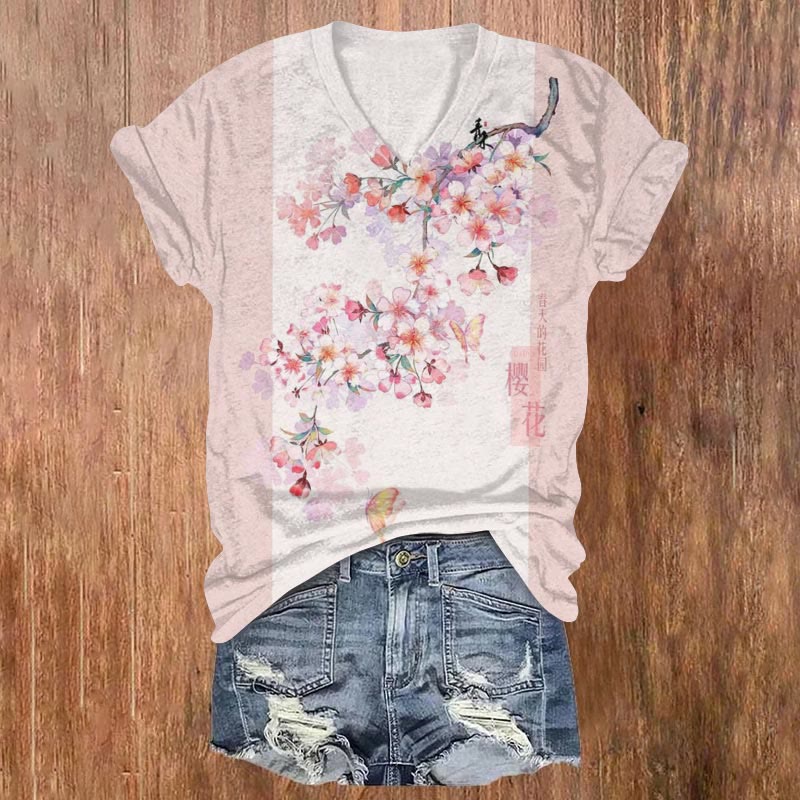 Dashingsoul Colorblock Sakura Butterfly Art Print Casual V-neck Short-sleeved T-shirt