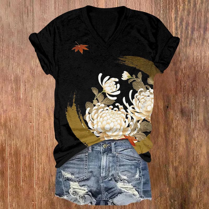 Dashingsoul Japanese Chrysanthemum And Maple Leaf Art Print Casual V-neck Short-sleeved T-shirt