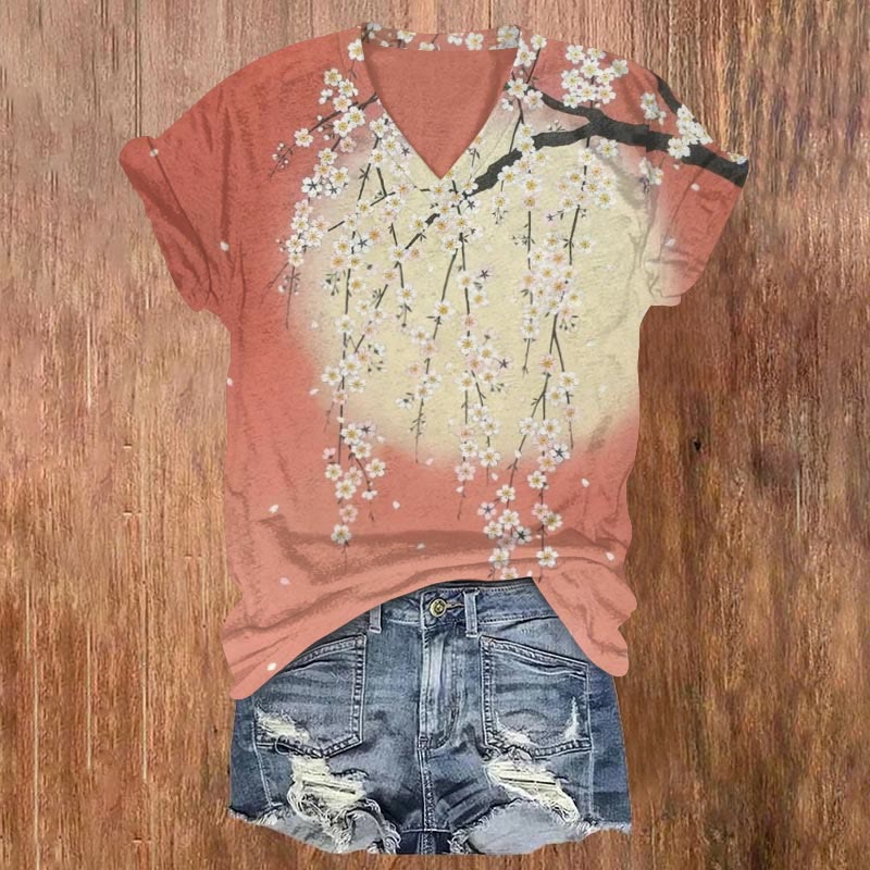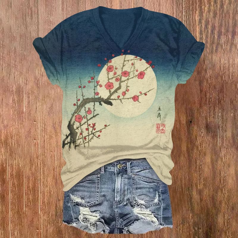 Dashingsoul Japanese Retro Full Moon Cherry Blossom Print Casual V-neck Short-sleeved T-shirt