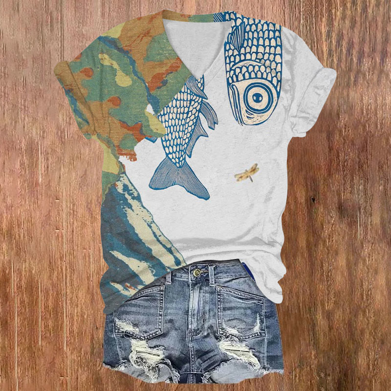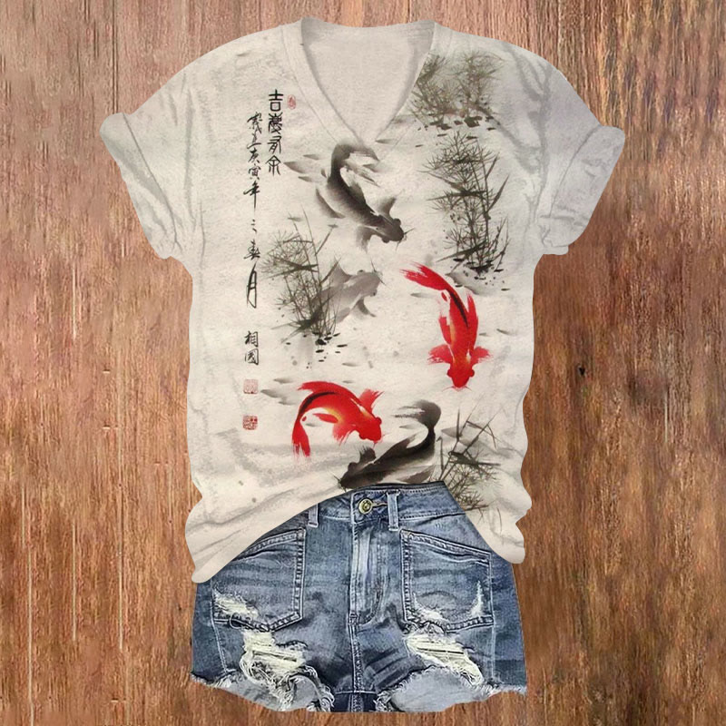 Dashingsoul Antique Abstract Art Koi Fish Print Casual V-neck T-shirt