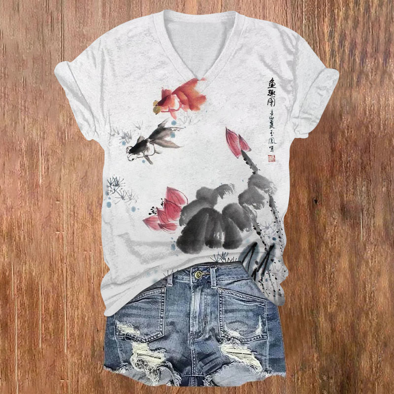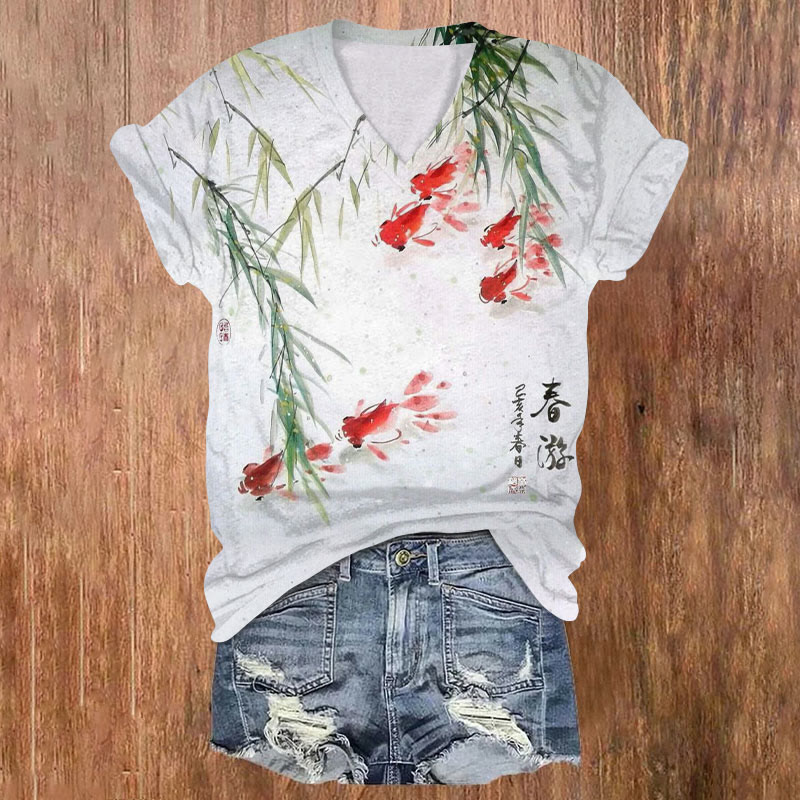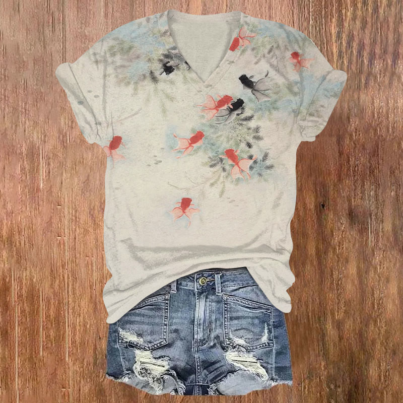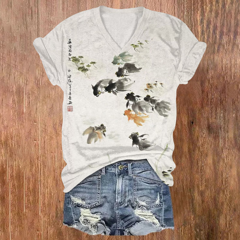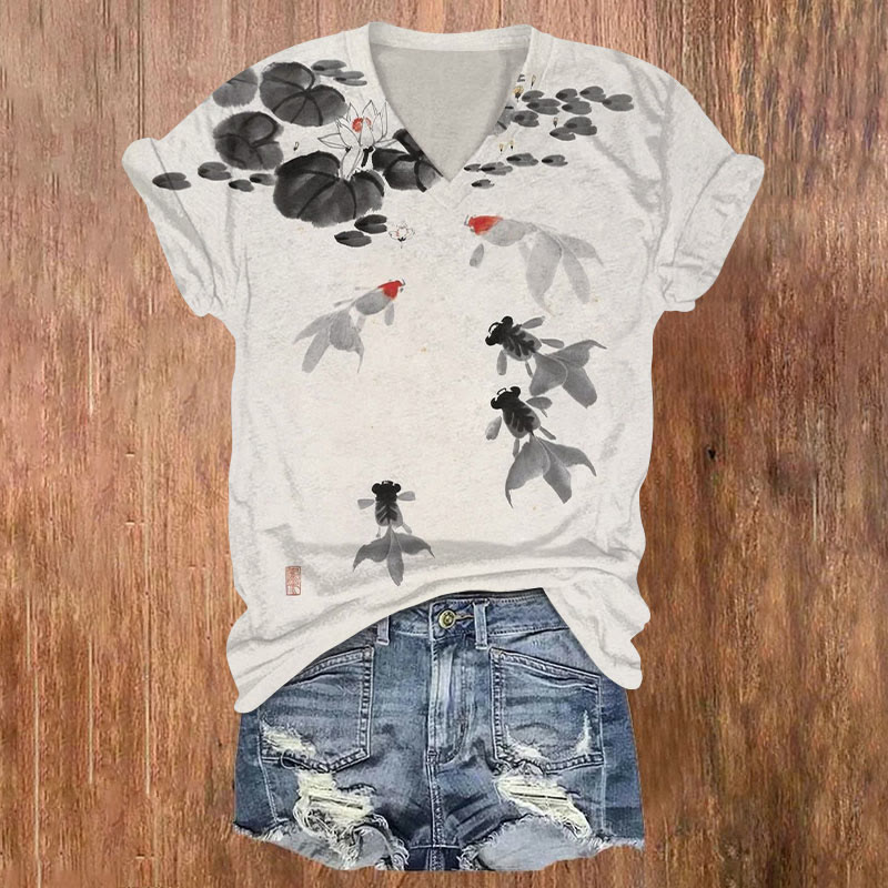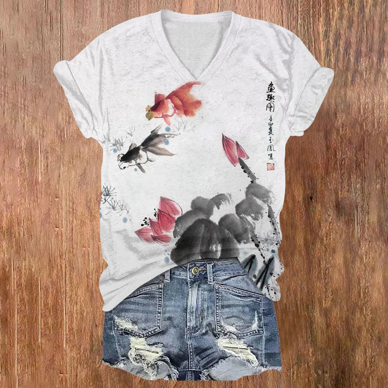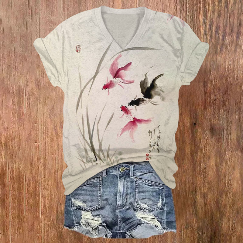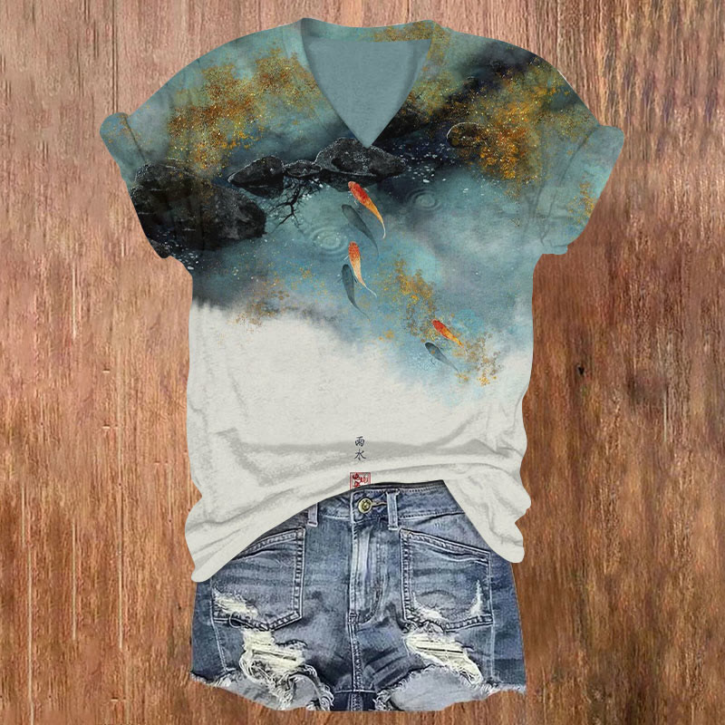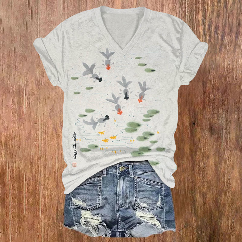 Dashingsoul Japanese Style Goldfish In The Pond Print Casual V-neck T-shirt