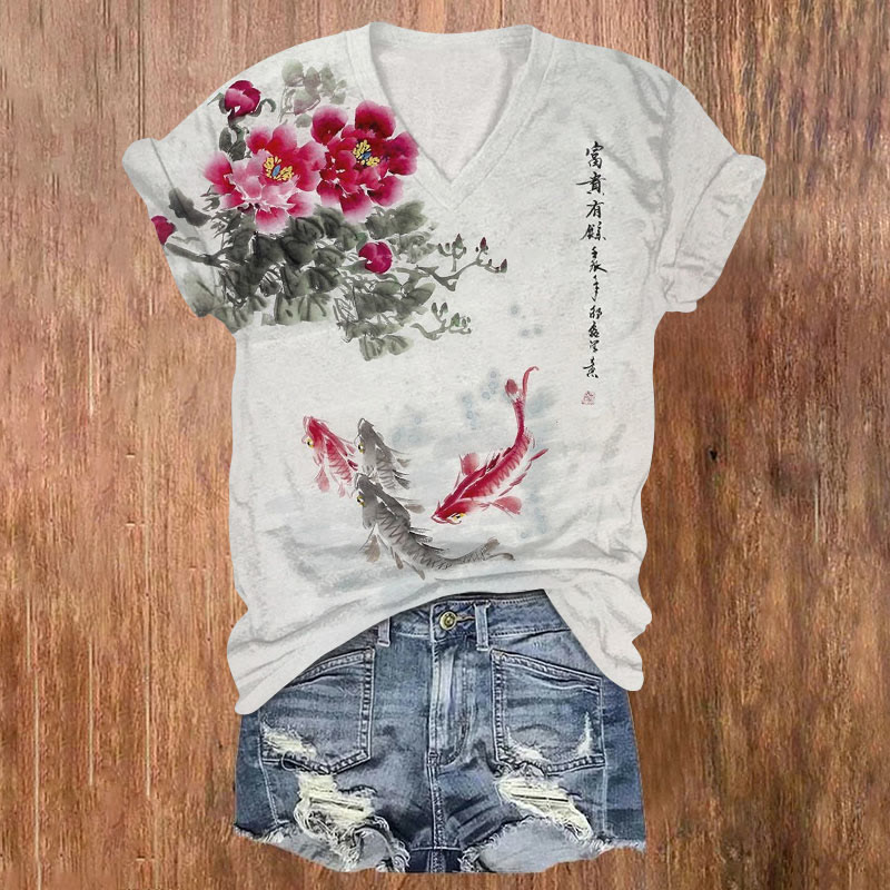 Dashingsoul Vintage Japanese Peony Koi Print V-neck T-shirt