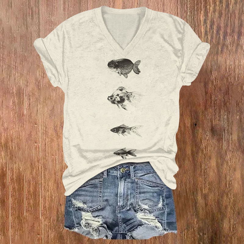 Dashingsoul Japanese Style Different Varieties Of Goldfish Print V-neck T-shirt