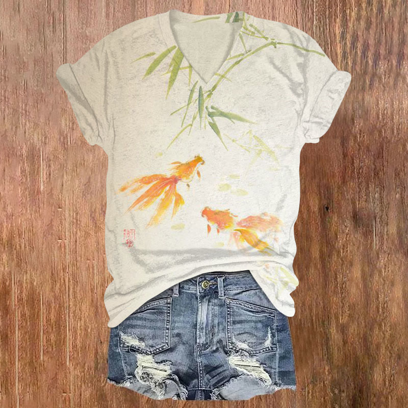 Dashingsoul Japanese Watercolor Bamboo Leaf Goldfish Print V-neck T-shirt