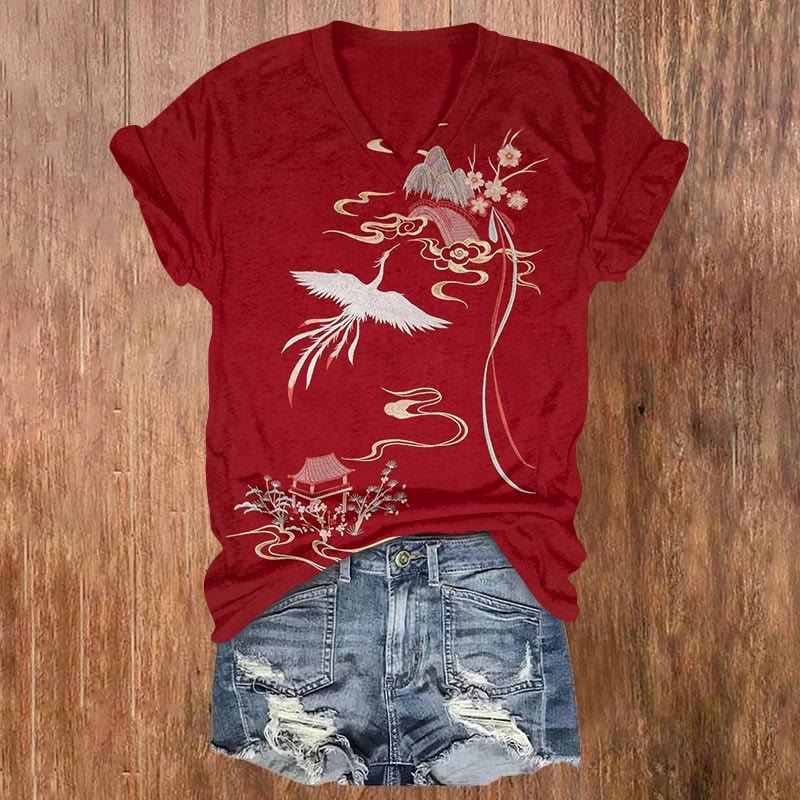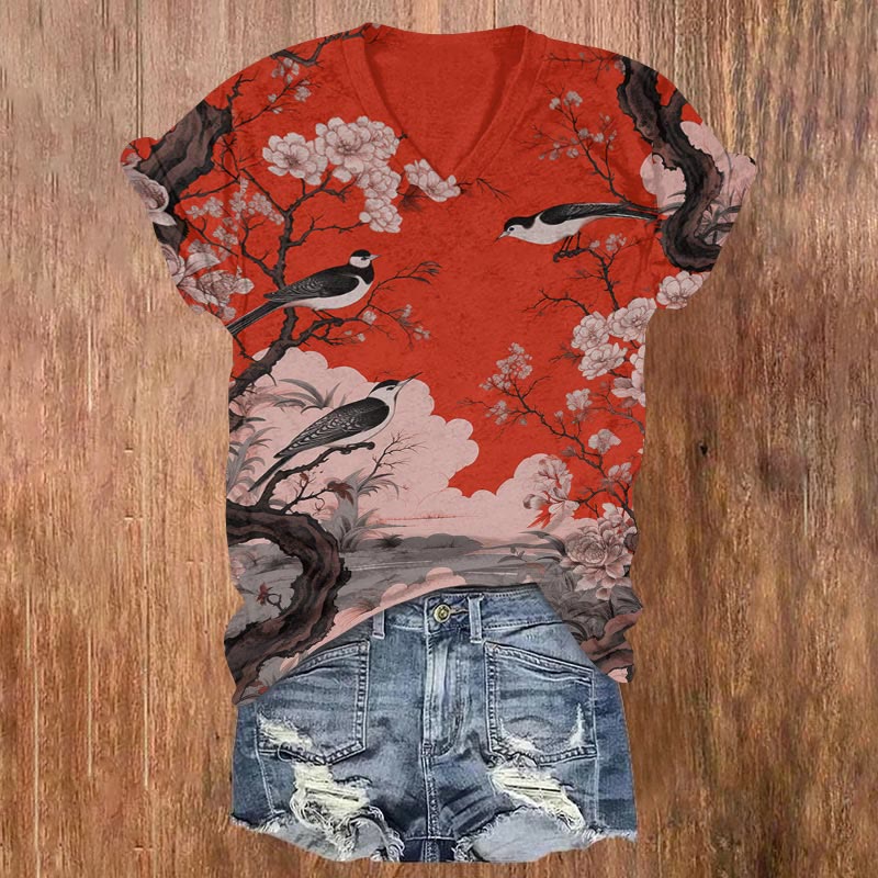Dashingsoul Japanese Flower And Bird Painting Art Print Casual V-neck T-shirt