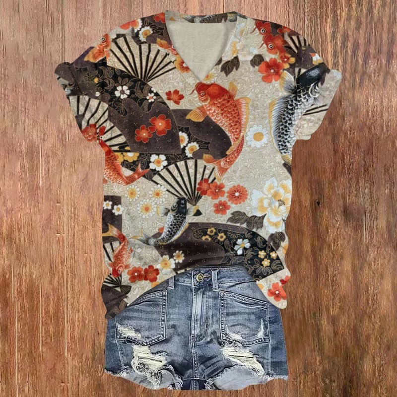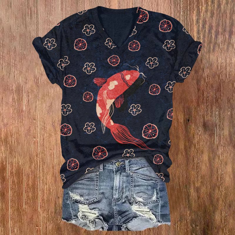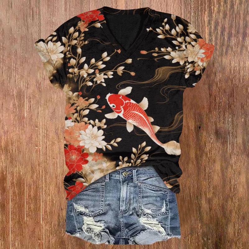 Dashingsoul Japanese Koi Fish Flower Art Print Casual V-neck T-shirt