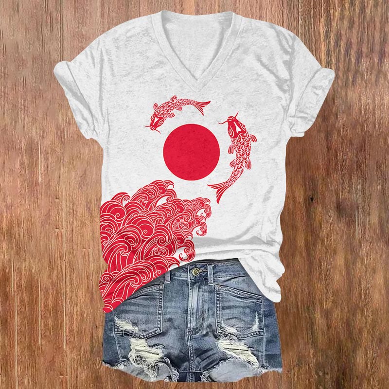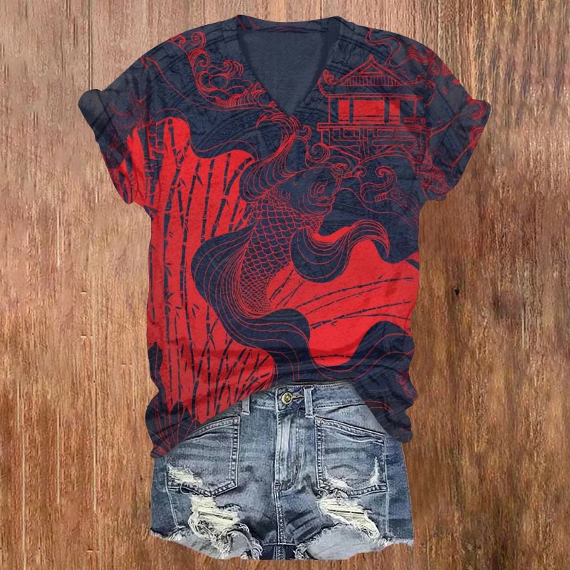 Dashingsoul Japanese Retro Koi Print Casual V-neck T-shirt