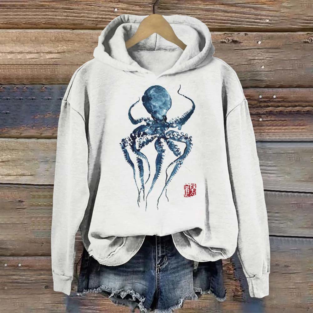 Dashingsoul Japanese Style Watercolor Octopus Vintage Print Casual Long Sleeve Hoodie