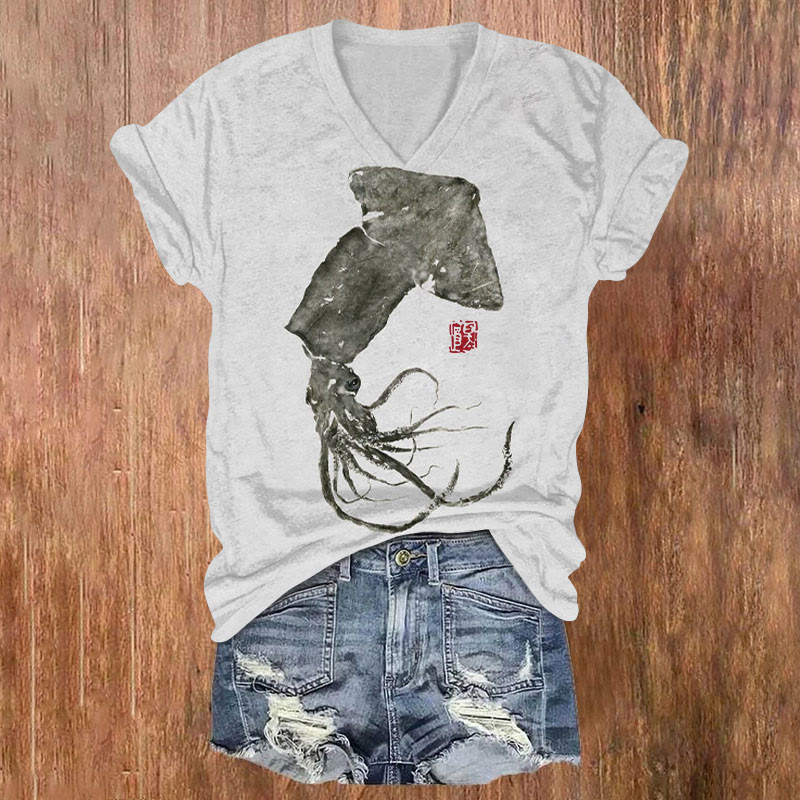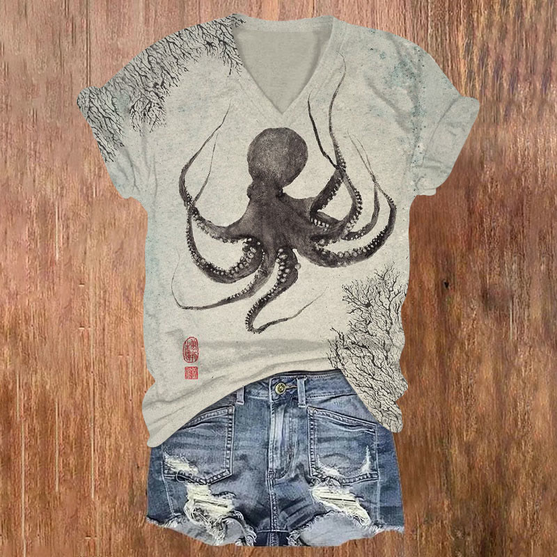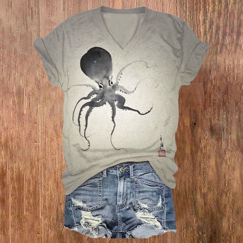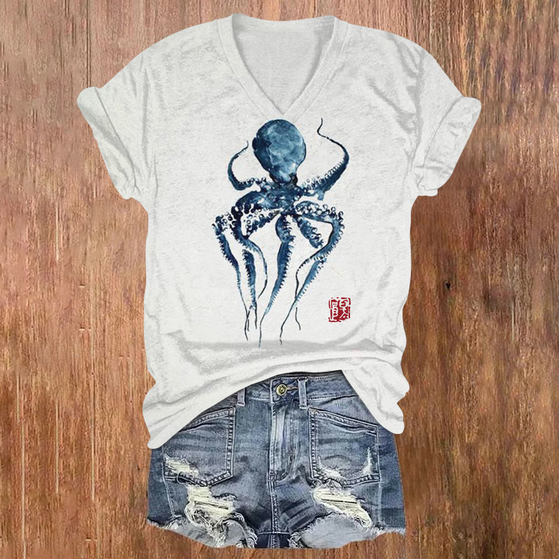 Dashingsoul Vintage Japanese Ink Octopus Print Casual V-neck T-shirt