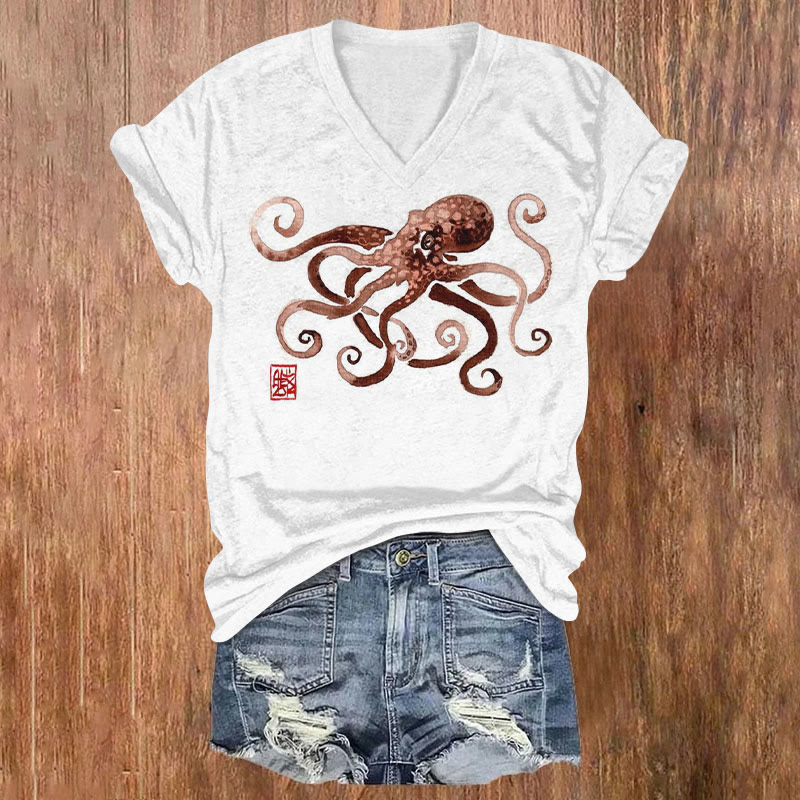 Dashingsoul Vintage Japanese Seal Octopus Print Casual V-neck T-shirt