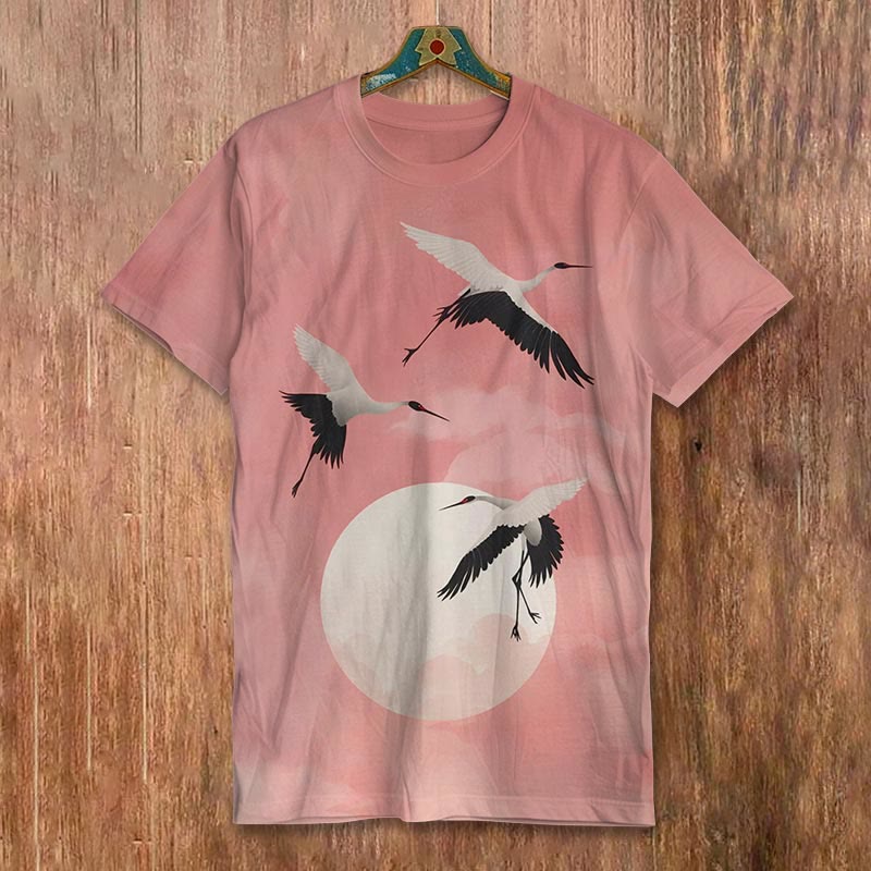 Dashingsoul Cranes At Sunrise Japanese Art Print Short-sleeved Men's Casual T-shirt