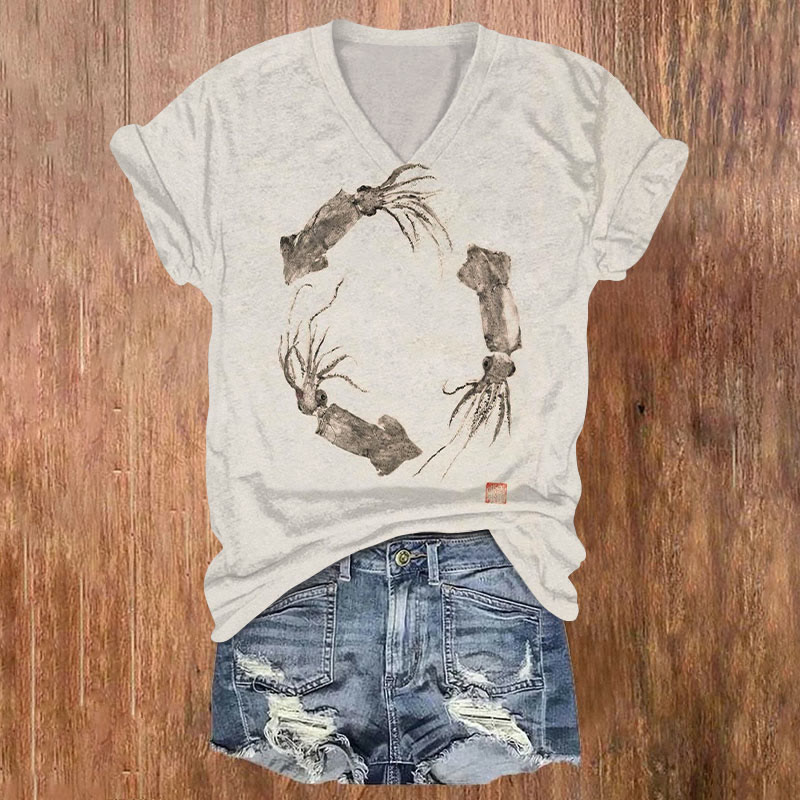 Dashingsoul Japanese Octopus Vintage Print Casual V-neck T-shirt