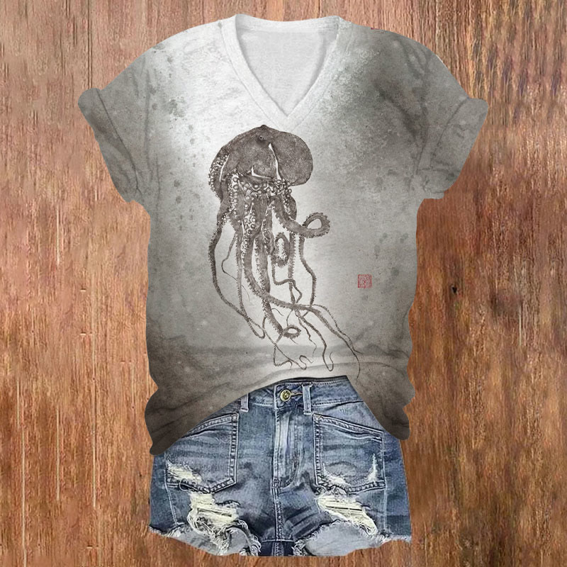 Dashingsoul Vintage Sfumato Octopus Print Casual V-neck T-shirt
