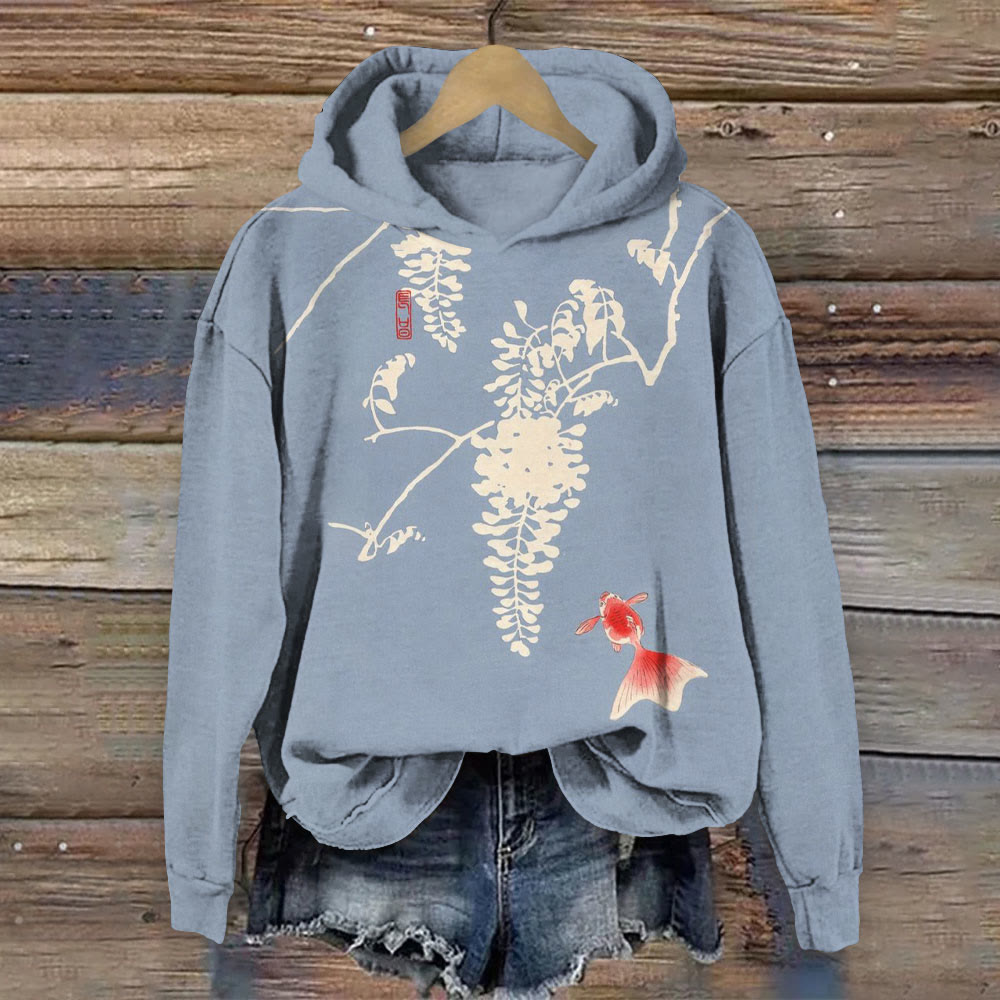 Dashingsoul Japanese Goldfish And Plant Print Casual Long Sleeve Hoodie