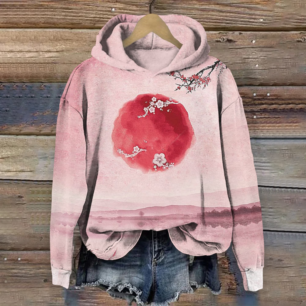Dashingsoul Japanese Watercolor Red Sun And Plum Blossom Print Casual Long Sleeve Hoodie