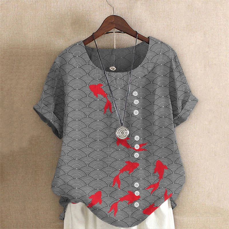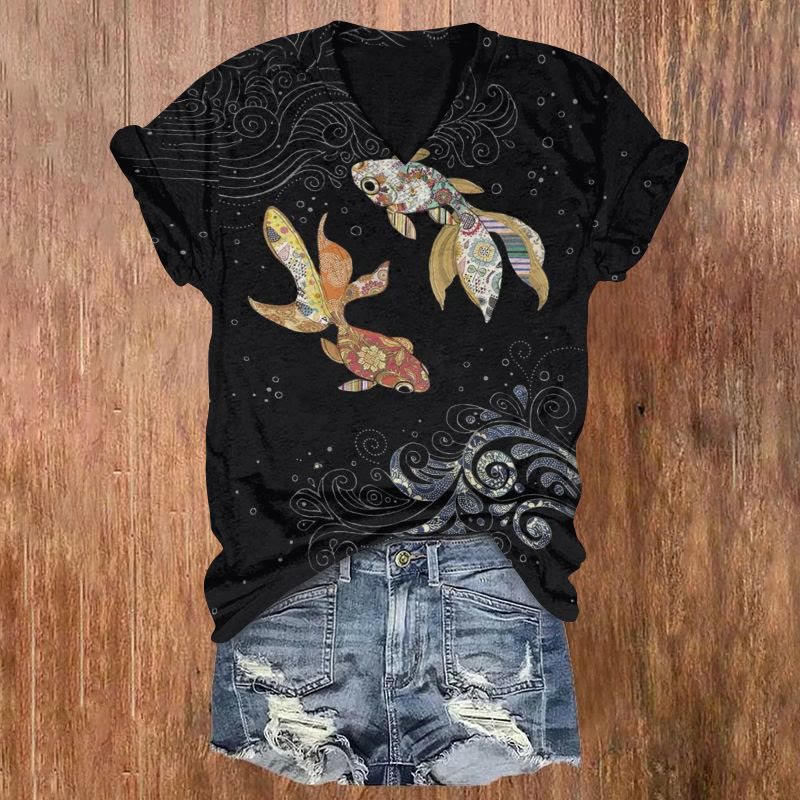Dashingsoul Vintage Japanese Floral Goldfish Print Casual V-neck T-shirt