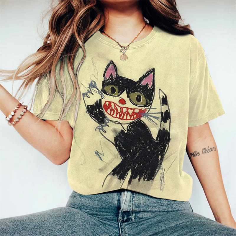 Dashingsoul Cute Horror Cat Crayon Art Print T-shirt
