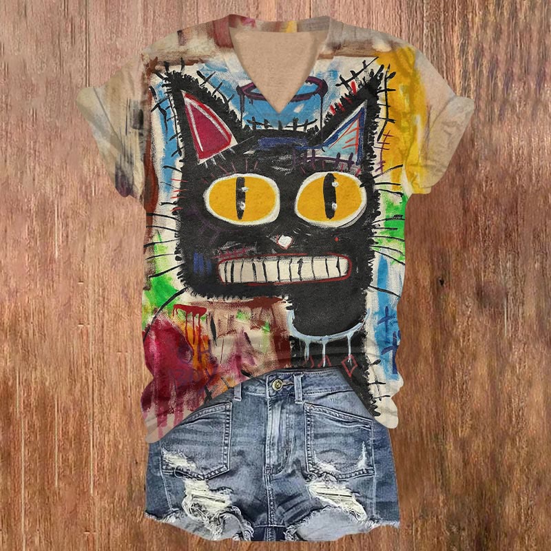 Dashingsoul Colorblock Abstract Cat Art Print Casual V-neck T-shirt
