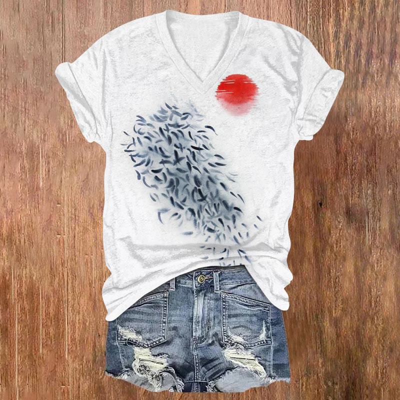 Dashingsoul Japanese Style Red Sun And A Group Of Fish Print Casual V-neck T-shirt