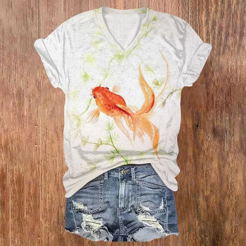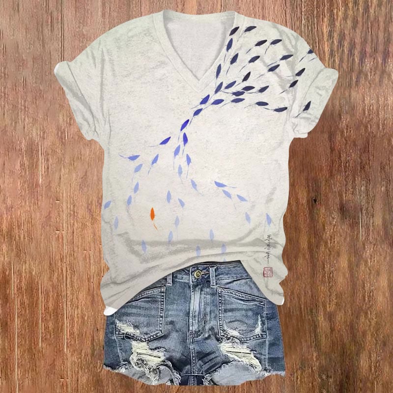 Dashingsoul Artistic Goldfish Ink Painting Art Print Casual V-neck T-shirt