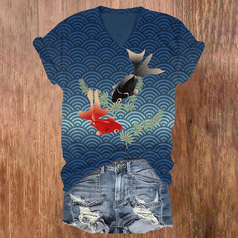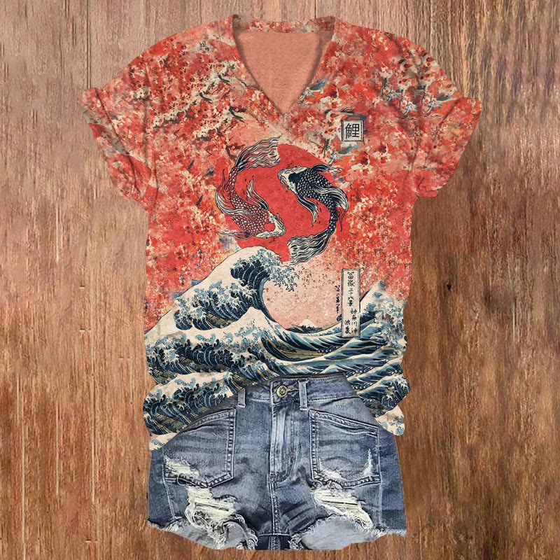Dashingsoul Japanese Koi Wave Print Casual V-neck T-shirt