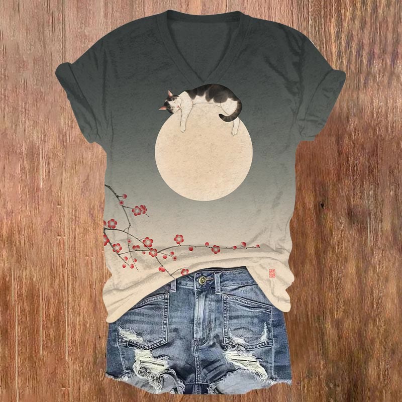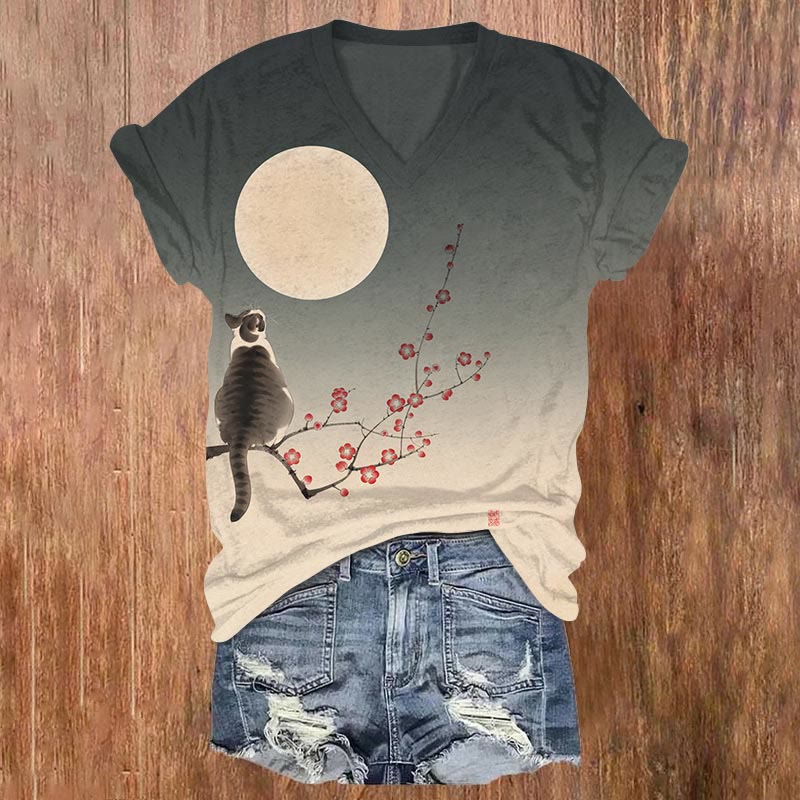 Dashingsoul Women's Japanese Cat On The Sakura Tree Watching Moon Print Casual V-neck T-shirt