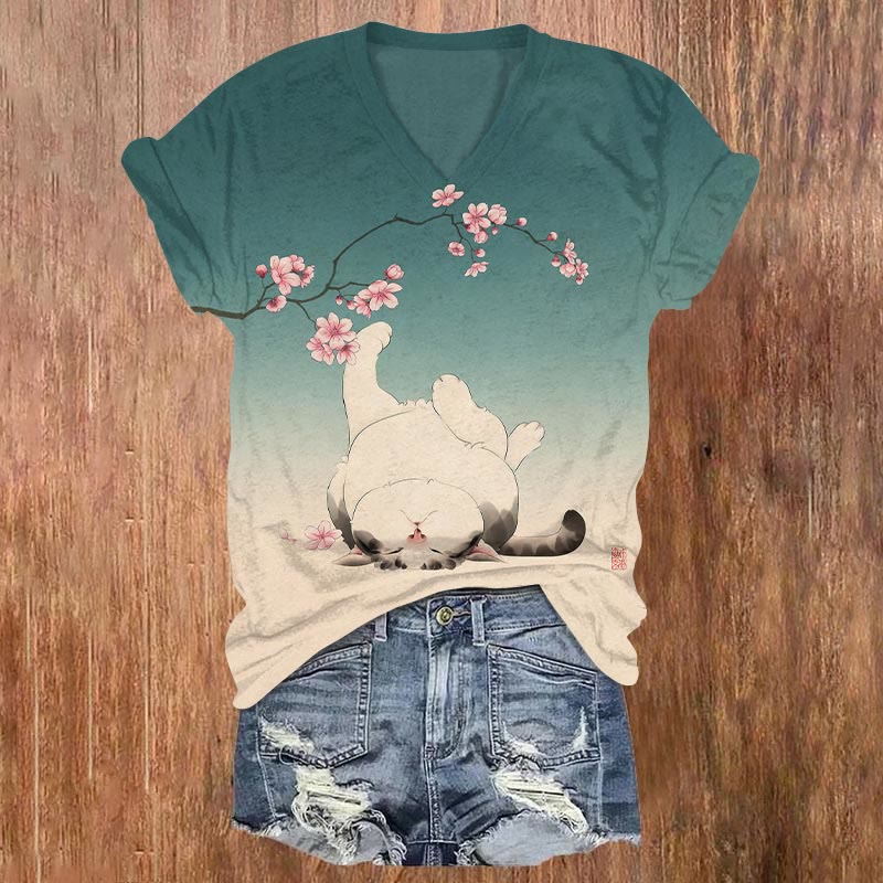 Dashingsoul Women's Japanese Sakura Lovely Cat With Belly Up Print Casual V-neck T-shirt