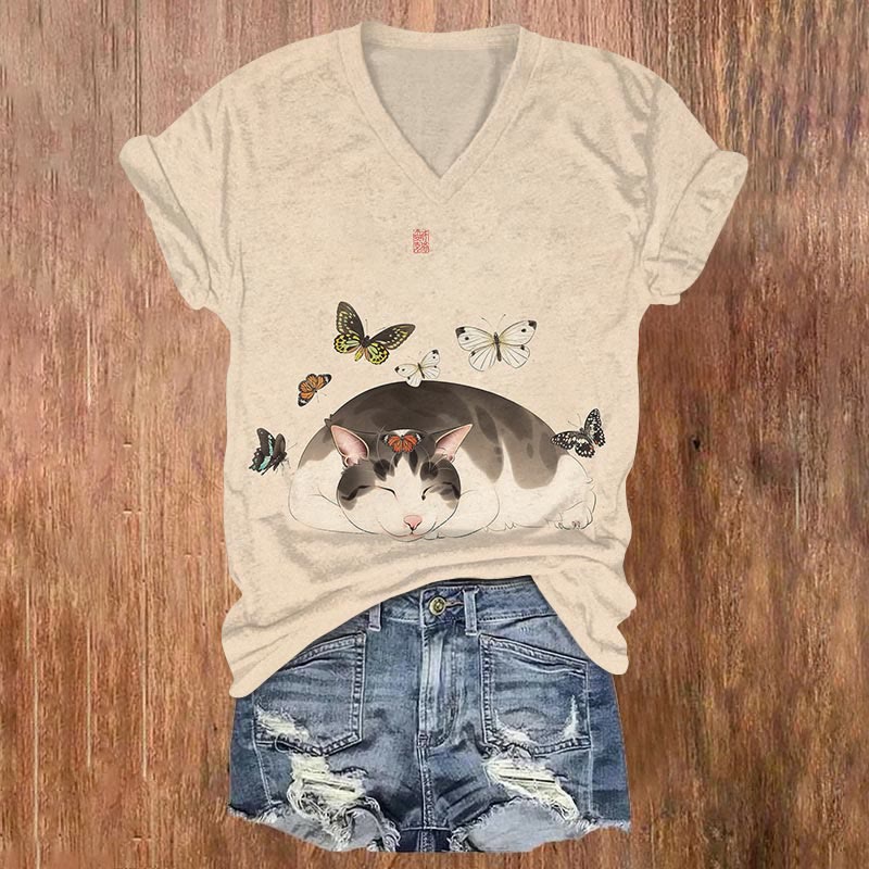 Dashingsoul Women's Japanese Colorful Butterfly Cute Cat Print Casual V-neck T-shirt