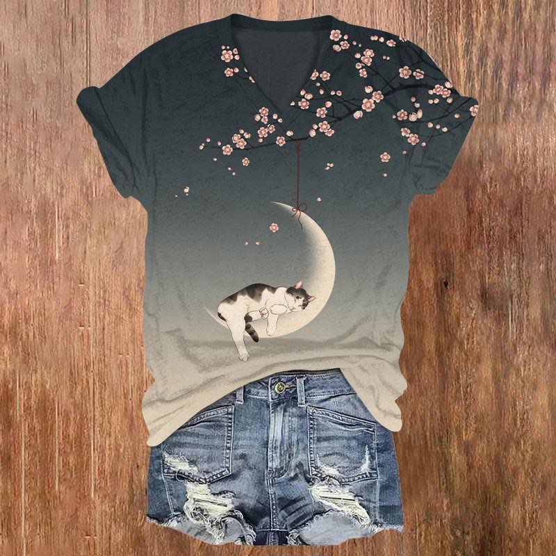Dashingsoul Women's Japanese Sakura Cat Sleeping On The Crescent Moon Print Casual V-neck T-shirt