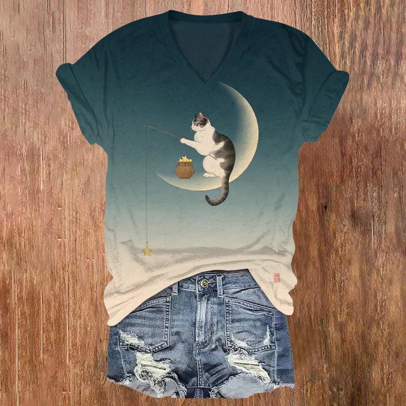 Dashingsoul Women's Creative Cat Fishing Stars On The Moon Print Casual V-neck T-shirt