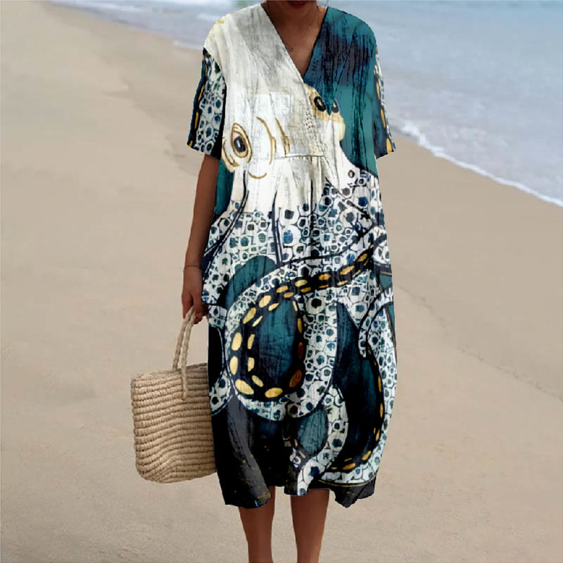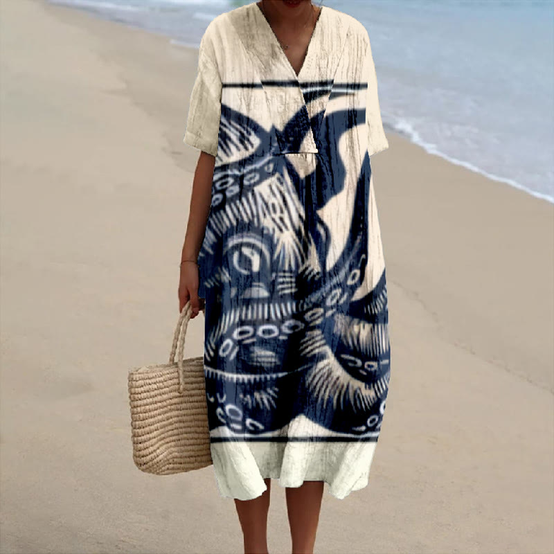 Dashingsoul Retro Style Octopus And Fish Print V-neck Short Sleeved Casual Midi Dress