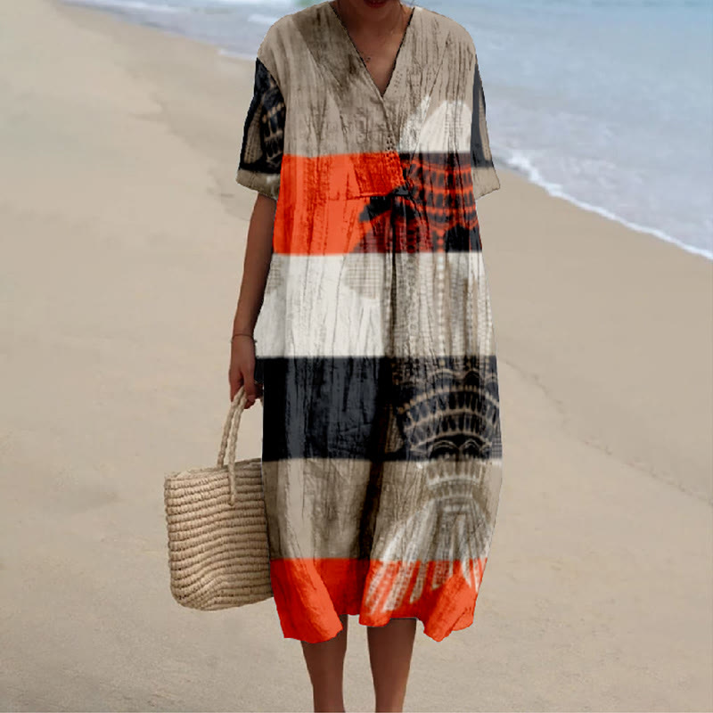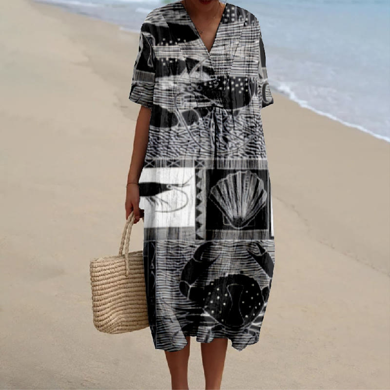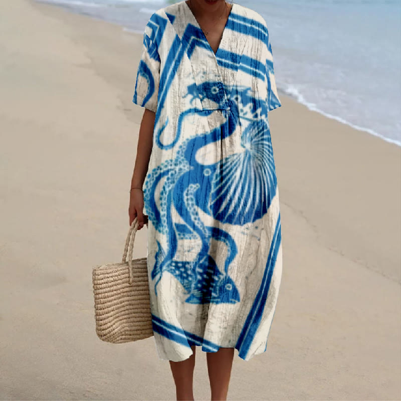 Dashingsoul Retro Sea Animals Print V-neck Short Sleeved Casual Midi Dress