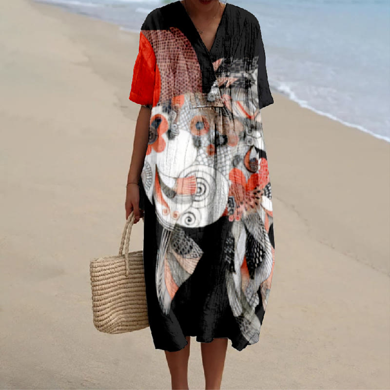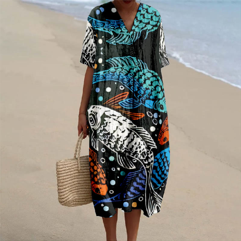 Japanese Multi-colored Swimming Fish Print V-neck Short Sleeved Casual Midi Dress