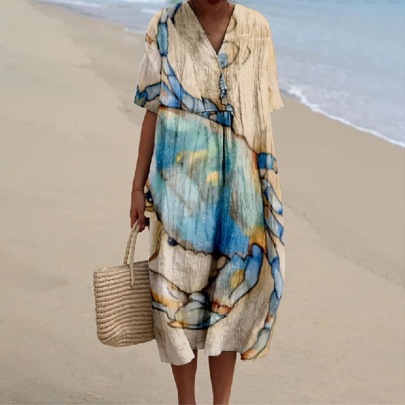 Dashingsoul Japanese Fantasy Crab Print V-neck Short Sleeved Casual Midi Dress