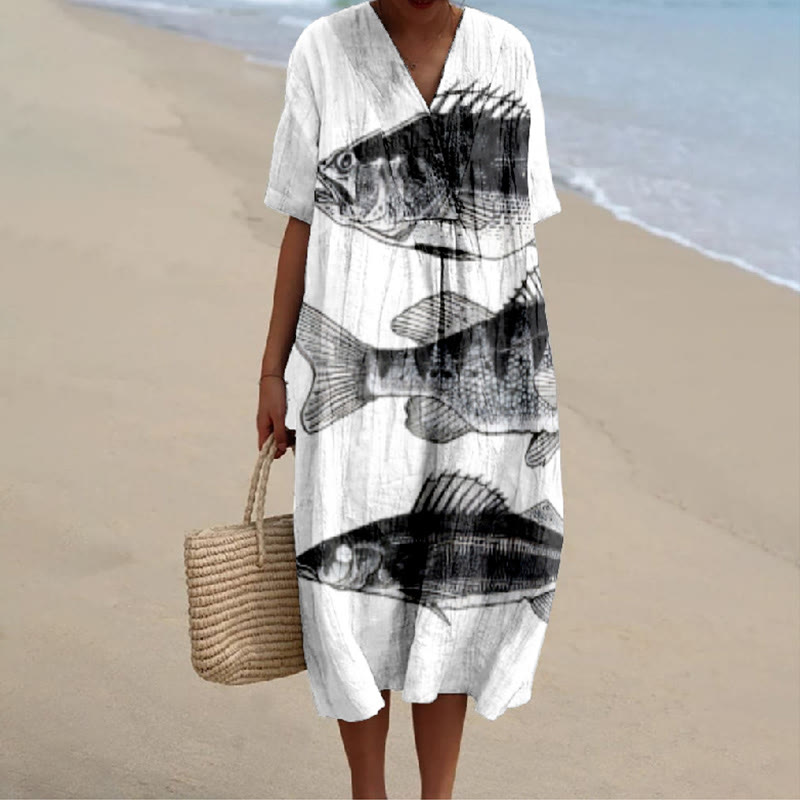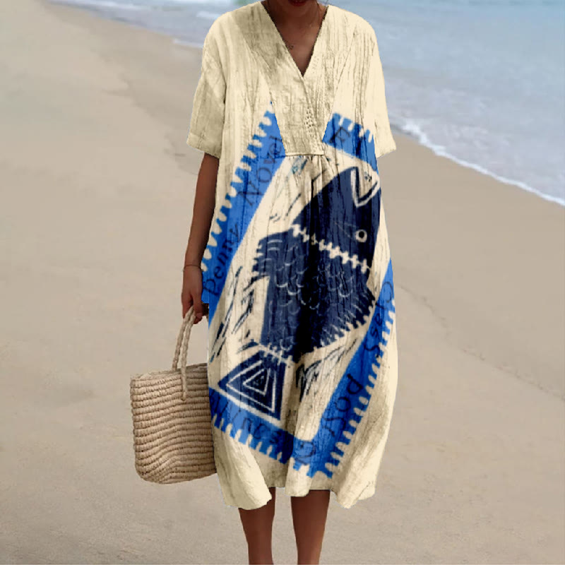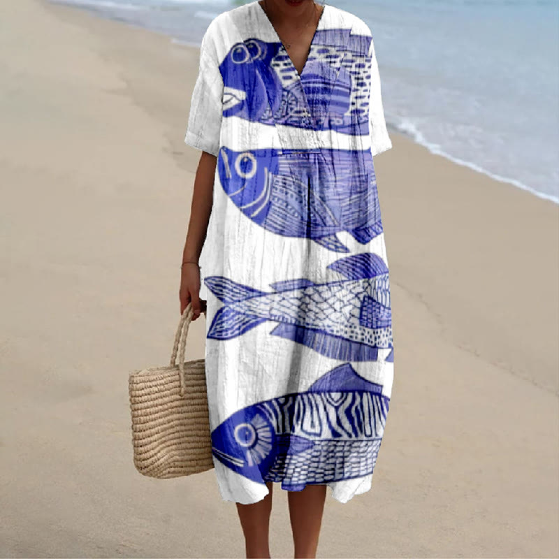 Dashingsoul Retro Style Fish Print V-neck Short Sleeved Casual Midi Dress