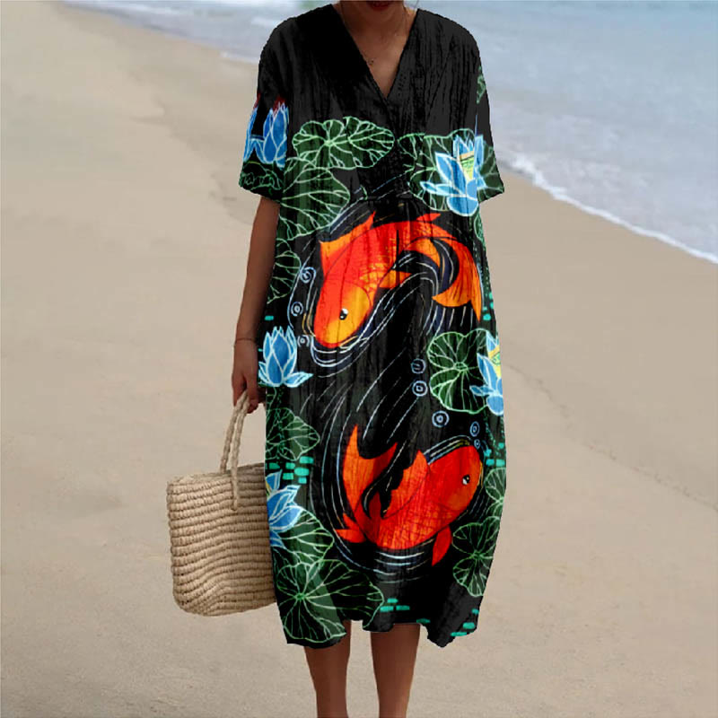 Koi Lotus Good Luck Print V-neck Short Sleeved Casual Midi Dress