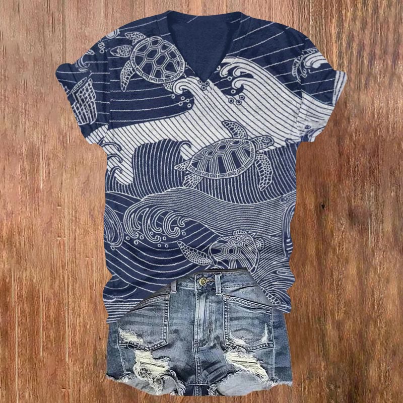 Dashingsoul Retro Japanese Style Line Art Waves Sea Turtle Print Casual V-neck T-shirt